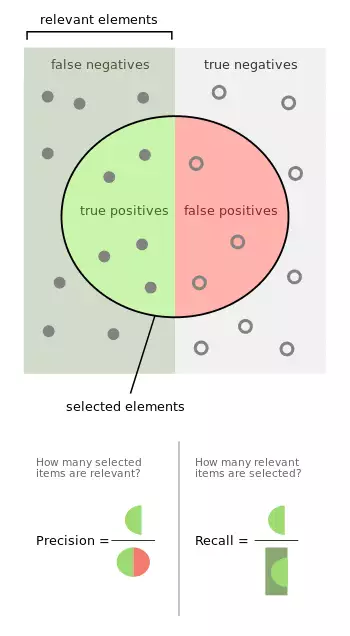 Suppose a computer program for recognizing dogs (the relevant element) in photographs identifies eight dogs in a picture containing ten cats and twelve dogs, and of the eight it identifies as dogs, five actually are dogs (true positives), while the other three are cats (false positives). Seven dogs were missed (false negatives), and seven cats were correctly excluded (true negatives). The program's precision is then 5/8 (true positives / all positives) while its recall is 5/12 (true positives / relevant elements).