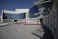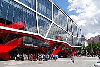 Other prominent 20th-century structures include the Most Slovenského národného povstania (Bridge of the Slovak national uprising) across the Danube featuring a UFO-like tower restaurant, Slovak Radio's inverted-pyramid-shaped headquarters, and the uniquely designed Kamzík TV Tower with an observation deck and rotating restaurant. In the early 21st century, new edifices have transformed the traditional cityscape. At the beginning of the 21st Century, a construction boom has spawned new public structures,[95] such as the Most Apollo and a new building of the Slovak National Theatre,[96] as well as private real-estate development.[97]