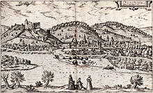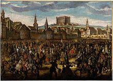The Kingdom of Hungary was defeated by the Ottoman Empire in the Battle of Mohács in 1526. The Turks besieged and damaged Pressburg, but failed to conquer it.[33] Owing to Ottoman advances into Hungarian territory, the city was designated the new capital of Hungary in 1536, after becoming part of the Habsburg Monarchy and marking the beginning of a new era. The city became a coronation town and the seat of kings, archbishops (1543), the nobility and all major organisations and offices. Between 1536 and 1830, eleven Hungarian kings and queens were crowned at St. Martin's Cathedral.[34] The 17th century was marked by anti-Habsburg uprisings, fighting with the Turks, floods, plagues and other disasters, which diminished the population.[35]
