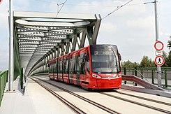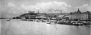 Industry developed rapidly in the 19th century. The first horse-drawn railway in the Kingdom of Hungary,[48] from Pressburg to Szentgyörgy (Svätý Jur), was built in 1840.[49] A new line to Vienna using steam locomotives was opened in 1848, and a line to Pest in 1850.[50] Many new industrial, financial and other institutions were founded; for example, the first bank in present-day Slovakia was founded in 1842.[51] The city's first permanent bridge over the Danube, Starý most, was built in 1891.[52]
