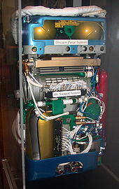 An emergency backup was provided in case the main system failed, by a separate unit called the Oxygen Purge System (OPS), mounted on top of the PLSS, immediately behind the astronaut's helmet. The OPS maintained suit pressure and removed carbon dioxide, heat and water vapor through a continuous, one-way air flow vented to space. When activated, the OPS provided oxygen to a separate inlet on the pressure suit, once a vent valve on a separate suit outlet was manually opened. The OPS provided a maximum of about 30 minutes of emergency oxygen for breathing and cooling.[2] This could be extended to 75 to 90 minutes with a "buddy system" hose that used the other astronaut's functional PLSS for cooling (only). This allowed the vent valve to be partly closed to decrease the oxygen flow rate.[1]