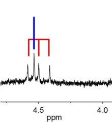 The net result is not a signal consisting of 4 peaks but three: one signal at 7 Hz above 2.5 ppm, two signals occur at 2.5 ppm, and a final one at 7 Hz below 2.5 ppm. The ratio of height between them is 1:2:1. This is known as a triplet and is an indicator that the proton is three-bonds from a CH2 group.