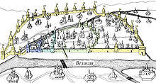 Pskov, along with Novgorod, was an important centre of trade between Russia and Western Europe. Already in the 13th century German merchants were present in Zapskovye area of Pskov and the Hanseatic League had a trading post in the same area in the first half of 16th century which moved to Zavelichye after a fire in 1562.[9][10] Pskov's main trade partners were Riga, Reval and Dorpat.[11] The wars with Livonian Order, Poland-Lithuania and Sweden interrupted the trade but it was maintained until the 17th century, with Swedish merchants gaining the upper hand eventually.[10]