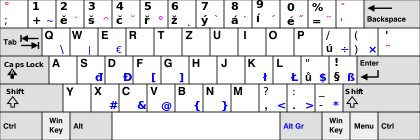 The QWERTZ keyboard layout is commonly used in the Czech Republic, but the QWERTY variant is an unofficial option. The characters from the American keyboard (@#$&\|[]{}<>^`~*) and some other characters and diacritic signs (÷פ€ßĐ𣳰˘˝·˛¸) that are missing on the Czech mechanical typewriter keyboard can be accessed with the AltGr key. The layout on the picture is supported by Microsoft Windows. In internet poll in 2013 56% of Czech users used QWERTZ and 44% used QWERTY,[3] but in 2020 57% of Czech users used QWERTY and 43% used QWERTZ.[4]
