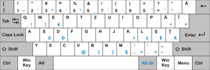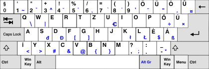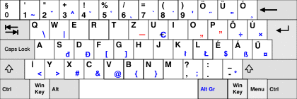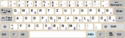 The Bosnian, Croatian, Serbian Latin and Slovene keyboard layout has five additional special characters Č, Ć, Ž, Š and Đ. This keyboard layout was standardized in the 1980s in Yugoslavia. Characters Ć and Đ are only part of Gaj's Latin alphabet but not part of the Slovene alphabet, nevertheless they remain in Slovenian keyboards (for economic reasons, for historical reasons and for writing words in the closely related South Slavic languages). The Ž is on the right side of the Ć key on keyboards which have a longer backspace key, and the usual inverted L shaped Enter key. The layout makes heavy use of the AltGr (right Alt) key for non-alphabetic characters and dead key combinations for adding diacritics to Latin characters. It is possible to type German and Italian using only the Bosnian/Croatian/Serbian keyboard layout.