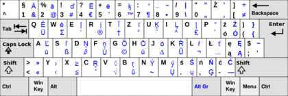 Sorbian QWERTZ is practically identical to the German layout, but the additional Sorbian characters can be entered with dead keys; it has three different layouts: Standard, Legacy, and Extended. All are supported by Microsoft Windows (Windows 7 and later only).[2]
