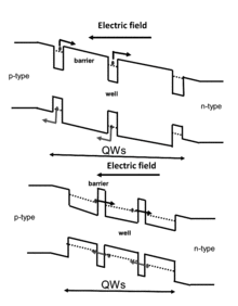 With the effective use of carriers in the QWs, researchers can increase the efficiency of quantum well solar cells (QWSCs). Within QWs in the intrinsic region of the p-i-n solar cells, optically generated carriers are either collected by the built-in field or lost due to carrier recombination.[8] Carrier recombination is the process in which a hole and electron recombine to cancel their charges. Carriers can be collected through drift by the electric field. One can either use thin wells and transport carriers via thermionic emission or use thin barriers and transport carriers via tunneling.
