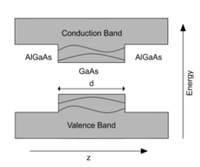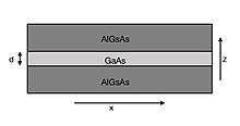One of the simplest quantum well systems can be constructed by inserting a thin layer one type of semiconductor material between two layers of another with a different band-gap. Consider, as an example, two layers of AlGaAs with a large bandgap surrounding a thin layer of GaAs with a smaller band-gap. Let’s assume that the change in material occurs along the z-direction and therefore the potential well is along the z-direction (no confinement in the x–y plane.). Since the bandgap of the contained material is lower than the surrounding AlGaAs, a quantum well (Potential well) is created in the GaAs region. This change in band energy across the structure can be seen as the change in the potential that a carrier would feel, therefore low energy carriers can be trapped in these wells.[7]