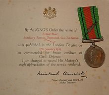 The Commendation for Brave Conduct was established in 1939 at the beginning of World War II. No Royal Warrant or other public statement was issued that specified the title, precedence and eligibility of the award, suggesting it was a prompt wartime solution to a gap in the awards available to reward gallantry by non-combatants, particularly those involved in Civil Defence and the Merchant Navy. Awards were published in the London Gazette,[1] with most entries referring to a 'Commendation for brave conduct', or simply 'Commendation'. It was not formally described as the 'King's Commendation for Brave Conduct' until September 1945.[2] Commendations could be made posthumously, enabling official recognition of bravery in all circumstances, since other gallantry awards, except for the Victoria Cross and the George Cross, could not be awarded posthumously.[1]