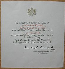 - With the outbreak of World War II a system of commendations was again established. The first awards were announced in the London Gazette on 15 December 1939,[9] when names of officers and men of the Merchant Navy ships "Mopan", "Lochgoil" and "Goodwood" were published following 'an expression of commendation of their good services' in action with U-boats and mines.[1]
