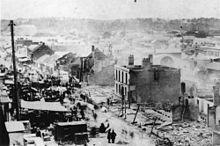 In 1864, there were two significant fires along the street.[3] The September 1864 fire started in the Little Wonder store on Edward Street[4] which destroyed 14 shops in Queen Street. This event later became known as Bulcock's Fire. On 1 December 1864, the Great Fire of Brisbane started within the cellar of a Queen Street drapery store which burnt down buildings bordering Queen Street, as well as Albert Street, Edward Street, George Street and Elizabeth Street.[5] Brisbane Courier described the fire as "the whole of the business premises and private residences...were, in a couple of hours, reduced to a heap of ruins".[6]