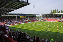 It is the world's oldest international football stadium that still hosts international matches, having hosted Wales' first home international match in 1877,[3] and has hosted more Wales international matches than any other ground.[4] The record attendance at the ground was set in 1957, when Wrexham hosted a match against Manchester United in front of 34,445 spectators.[5]