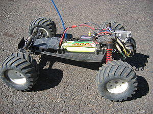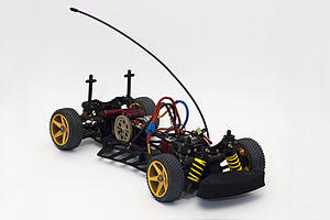 Radio-controlled cars (or RC cars for short) are miniature model cars or trucks that can be controlled from a distance using a specialized transmitter or remote. The term "RC" has been used to mean both "remote controlled" and "radio controlled", where "remote controlled" includes vehicles that are controlled by radio, infrared or a physical wire connection (the latter is now obsolete). Common use of "RC" today usually refers only to vehicles controlled by radio, and this article focuses on radio-controlled vehicles only.[1]