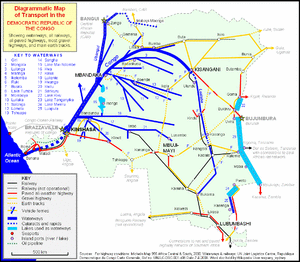 - ^ UNJLC Map number: UNJLC DRC 001 (7 MB) Archived 2007-07-24 at Archive.today. This source distinguishes between 'operational' and 'very degraded' lines, but detail on some sections is obscured by roads.