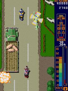 Fuel is a major obstacle of the game as well, as players must refuel their bike by stopping at the filling station, however this will also cause competitors to take advantage, as they never run out of fuel and running out of it results in a game over unless more credits are inserted into the arcade machine to continue playing.[3][4]