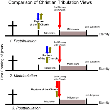 Differing viewpoints exist about the exact timing of the rapture and whether Christ's return will occur in one event or two. Pretribulationism distinguishes the rapture from the second coming of Jesus Christ mentioned in the Gospel of Matthew, 2 Thessalonians, and Revelation. This view holds that the rapture will precede the seven-year Tribulation, which will culminate in Christ's second coming and be followed by a thousand-year Messianic Kingdom.[5][6] This theory grew out of the translations of the Bible that John Nelson Darby analyzed in 1833. Pretribulationism is the most widely held view among Christians believing in the rapture today, although this view is disputed within evangelicalism.[7] Some assert a post-tribulational rapture.