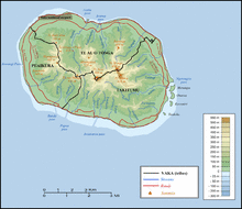 The earliest evidence of human presence in the Southern Cook Islands has been dated to around AD 1000. Oral tradition tells that Rarotonga was settled by various groups, including Ata-i-te-kura, Apopo-te-akatinatina and Apopo-te-ivi-roa in the ninth century, and Tangi'ia Nui from Tahiti and Karika from Samoa in 1250.[3] An early ariki, Toi, is said to have built Te Ara Nui o Toi or Ara Metua, a paved road that encircles the island, though the sites adjacent to it are dated to 1530.[4] Trading contact was evidently maintained with the Austral Islands, Samoa and the Marquesas to import basalt that was used for making local adze heads,[5] while a pottery fragment found on Ma'uke has been traced to Tongatapu to the west, the main island of Tonga.[6] The ultimate origin of almost all the islanders’ settlement cargo can be traced back to Southeast Asia: not just their chickens, Pacific rats, Polynesian pigs, Pacific dogs and crops, but also several kinds of lizards and snails. Among the species that are understood to have reached Rarotonga by this means are at least two species of geckos and three of skinks. Likewise, the ultimate origin of almost 30 of their crops lies in the west.[7]