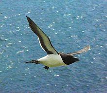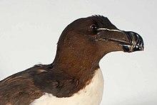 The razorbill or lesser auk[3] (Alca torda) is a colonial seabird in the monotypic genus Alca of the family Alcidae, the auks. It is the closest living relative of the extinct great auk (Pinguinis impennis).[4] Wild populations live in the subarctic waters of the Atlantic Ocean.