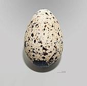 Females lay a single egg per year, usually from late April to May. The egg is an ovoid-pyramidal shape, cream color with has dark brown blotches. Incubation starts generally 48 hours after laying the egg. Females and males take turns incubating the egg several times daily for a total of approximately 35 days before hatching occurs. Razorbill chicks are semi-precocial.[23] During the first two days after hatching, the chick will spend the majority of its time under the parent's wing. There is always one parent at the nest site while the other goes to sea to collect food for the chick. The hatchling develops a complete sheath 10 days after hatching. After 17–23 days, the chick leaves the nest by jumping from a cliff, closely followed by the male parent, who will accompany the chick to sea.