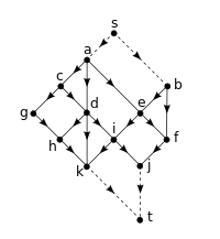 An even faster method for pre-processing, due to T. Kameda in 1975,[7] can be used if the graph is planar, acyclic, and also exhibits the following additional properties: all 0-indegree and all 0-outdegree vertices appear on the same face (often assumed to be the outer face), and it is possible to partition the boundary of that face into two parts such that all 0-indegree vertices appear on one part, and all 0-outdegree vertices appear on the other (i.e. the two types of vertices do not alternate).