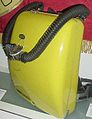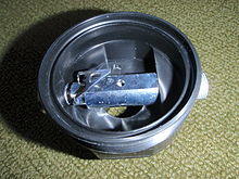 During the Second World War, captured Italian frogmen's rebreathers influenced improved designs for British rebreathers.[12] Many British frogmen's breathing sets used aircrew breathing oxygen cylinders salvaged from shot-down German Luftwaffe aircraft. The earliest of these breathing sets may have been modified Davis Submerged Escape Apparatus; their fullface masks were the type intended for the Siebe Gorman Salvus, but in later operations different designs were used, leading to a fullface mask with one big face window, at first circular or oval and later rectangular (mostly flat, but the sides curved back to allow better vision sideways). Early British frogman's rebreathers had rectangular counterlungs on the chest like Italian frogman's rebreathers, but later designs had a square recess in the top of the counterlung so it could extend further up toward the shoulders. In front they had a rubber collar that was clamped around the absorbent canister.[12] Some British armed forces divers used bulky thick diving suits called Sladen suits; one version of it had a flip-up single faceplate for both eyes to let the user get binoculars to his eyes when on the surface.