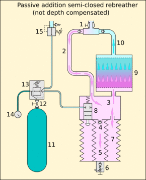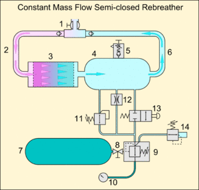 Semi-closed circuit equipment generally supplies one breathing gas such as air, nitrox or trimix at a time. The gas is injected into the loop at a constant rate to replenish oxygen consumed from the loop by the diver. Excess gas must be constantly vented from the loop in small volumes to make space for fresh, oxygen-rich gas. As the oxygen in the vented gas cannot be separated from the inert gas, semi-closed circuit is wasteful of oxygen.[21]