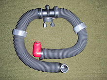 The first commercially practical closed-circuit scuba was designed and built by the diving engineer Henry Fleuss in 1878, while working for Siebe Gorman in London.[10][11] His self-contained breathing apparatus consisted of a rubber mask connected to a breathing bag, with (estimated) 50–60% O2 supplied from a copper tank and CO2 scrubbed by rope yarn soaked in a solution of caustic potash; the system giving a duration of about three hours.[11][12] Fleuss tested his device in 1879 by spending an hour submerged in a water tank, then one week later by diving to a depth of 5.5 m in open water, upon which occasion he was slightly injured when his assistants abruptly pulled him to the surface.