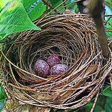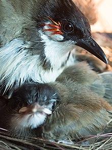 The breeding season is spread out and peaks from December to May in southern India and March to October in northern India.[21] Breeding may occur once or twice a year.[22] The courtship display of the male involves head bowing, spreading the tail and drooping wings.[22] The nest is cup-shaped, and is built on bushes, thatched walls or small trees. It is woven of fine twigs, roots, and grasses, and embellished with large objects such as bark strips, paper, or plastic bags.[15] Clutches typically contain two to three eggs.[22] Adults (possibly the female[7]) may feign injury to distract potential predators away from the nest.[22][23] The eggs have a pale mauve ground colour with speckles becoming blotches towards the broad end. Eggs measure 21 mm and are 16 mm wide.[24] Eggs take 12 days to hatch. Both parents take part in raising the young. Young birds are fed on caterpillars and insects which are replaced by fruits and berries as they mature.[7] The chicks are psilopaedic (having down only in the pterylae).[6] Eggs and chicks may be preyed on by the greater coucal and crows.[7]