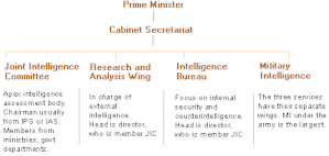 R&AW has been organised on the lines of the CIA.[25] The head of R&AW is designated Secretary (R) in the Cabinet Secretariat. Most of the previous chiefs have been experts on either Pakistan or China.[26] They also have the benefit of training in either the USA or the UK, and more recently in Israel.[27] The Secretary (R), is under the direct command of the Prime Minister, and reports on an administrative basis to the Cabinet Secretary, who reports to the Prime Minister. Moreover, the National Security Adviser is also regularly briefed by the Secretary (R). Reporting to the Secretary (R) are:[5]