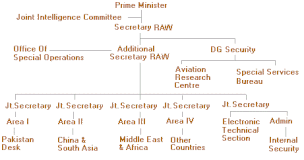 - An Additional Secretary responsible for the Office of Special Operations and intelligence collected from different countries processed by large number of Joint Secretaries, who are the functional heads of various specified desks with different regional divisions/areas/countries: Area one – Pakistan; Area two – China and Southeast Asia; Area three – the Middle East and Africa; and Area four – other countries. Two Special Joint Secretaries, reporting to the Additional Secretary, head the Electronics and Technical Department which is the nodal agency for ETS, NTRO and the RRC.