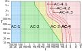 Log-log graph of the effect of alternating current I of duration T passing from left hand to feet as defined in IEC publication 60479-1.[3] AC-1: imperceptible; AC-2: perceptible but no muscle reaction; AC-3: muscle contraction with reversible effects; AC-4: possible irreversible effects; AC-4.1: up to 5% probability of ventricular fibrillation; AC-4.2: 5-50% probability of fibrillation; AC-4.3: over 50% probability of fibrillation