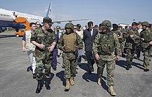 In February 2004 Haitian President Jean-Bertrand Aristide was overthrown in a coup d'état, leading to conflict within the country. The United States deployed Marines to Haiti as part of the multinational Operation Secure Tomorrow from February to July 2004. On March 13, Myers visited the United States troops deployed to Haiti.[10][11][12]