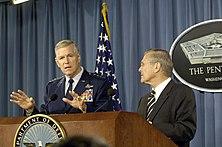 Together with Secretary of Defense Donald Rumsfeld, Myers conducted weekly press briefings at The Pentagon on the War on Terror.[5]