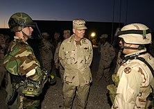 During his tenure as Chairman, Myers also oversaw the early stage of the invasion of Iraq. Together with CENTCOM commander General Tommy Franks, Myers coordinated the plan for the Iraqi invasion and the reconstruction of the country, and also established a combined joint task force in order to focus on post-conflict issues in Iraq.[5] Operation Iraqi Freedom was initiated on 20 March 2003, which was preceded by an airstrike on Saddam Hussein's Palace and followed by the Fall of Baghdad in April 2003. Operation Iraqi Freedom eventually led to the downfall of Saddam Hussein's 24-year regime and the captured of Hussein on December 13, 2003. Following Operation Iraqi Freedom, the Coalition Provisional Authority was established in Iraq and was succeeded by the Iraqi Interim Government, which presided over parliamentary elections in 2005.[6][7]