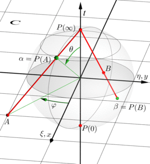 In mathematics, the Riemann sphere, named after Bernhard Riemann,[1] is a model of the extended complex plane, the complex plane plus a point at infinity. This extended plane represents the extended complex numbers, that is, the complex numbers plus a value ∞ for infinity. With the Riemann model, the point "∞" is near to very large numbers, just as the point "0" is near to very small numbers.