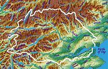 The Tay drains much of the lower region of the Highlands. It originates on the slopes of Ben Lui (Beinn Laoigh), around 25 miles (40 km) from the west coast town of Oban, in Argyll and Bute.[1] In 2011, the Tay Western Catchments Partnership determined as its source (as based on its 'most dominant and longest' tributary) a small lochan on Allt Coire Laoigh south of the summit.[2] The river has a variety of names in its upper catchment: for the first few miles it is known as the River Connonish; then the River Fillan; the name then changes to the River Dochart until it flows into Loch Tay at Killin.