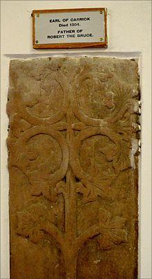 His first wife was Margery of Carrick, 3rd Countess of Carrick (11 Apr 1254 – November 1292), the daughter and heiress of Niall, 2nd Earl of Carrick.[8] Carrick was a Gaelic Earldom in Southern Scotland. Its territories contained much of today's Ayrshire and Dumfriesshire. The couple married at Turnberry Castle in 1271 and held the principal seats of Turnberry Castle and Lochmaben.