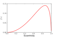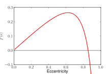 This equation can be solved numerically. The graph indicates that there are two solutions and thus the smaller one represents the stable equilibrium form (the ellipsoid with the smaller eccentricity). This solution determines the eccentricity of the tidal ellipsoid as a function of the distance to the main body. The derivative of the function f has a zero where the maximal eccentricity is attained. This corresponds to the Roche limit.