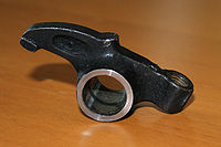 A rocker arm (in the context of an internal combustion engine of automotive, marine, motorcycle and reciprocating aviation types) is an oscillating lever that conveys radial movement from the cam lobe into linear movement at the poppet valve to open it. One end is raised and lowered by a rotating lobe of the camshaft (either directly or via a tappet (lifter) and pushrod) while the other end acts on the valve stem. When the camshaft lobe raises the outside of the arm, the inside presses down on the valve stem, opening the valve. When the outside of the arm is permitted to return due to the camshafts rotation, the inside rises, allowing the valve spring to close the valve.