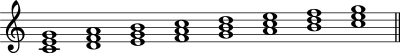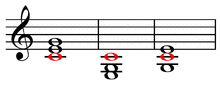 In tertian harmonic theory, wherein chords can be considered stacks of third intervals (e.g. in common practice tonality), the root of a chord is the note on which the subsequent thirds are stacked. For instance, the root of a triad such as C Major is C, independently of the vertical order in which the three notes (C, E and G) are presented. A triad can be in three possible positions, a "root position" with the root in the bass (i.e., with the root as the lowest note, thus C, E, G or C, G, E, from lowest to highest notes), a first inversion, e.g. E, C, G or E, G, C (i.e., with the note which is a third interval above the root, E, as the lowest note) and a second inversion, e.g. G, C, E or G, E, C, in which the note that is a fifth interval above the root (G ) is the lowest note.
