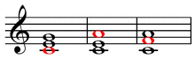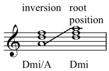 In music theory, the concept of root is the idea that a chord can be represented and named by one of its notes. It is linked to harmonic thinking—the idea that vertical aggregates of notes can form a single unit, a chord. It is in this sense that one speaks of a "C chord" or a "chord on C"—a chord built from C and of which the note (or pitch) C is the root. When a chord is referred to in Classical music or popular music without a reference to what type of chord it is (either major or minor, in most cases), it is assumed a major triad, which for C contains the notes C, E and G. The root need not be the bass note, the lowest note of the chord: the concept of root is linked to that of the inversion of chords, which is derived from the notion of invertible counterpoint. In this concept, chords can be inverted while still retaining their root.