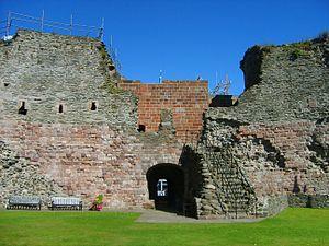 Following a long period of neglect, the 2nd Marquess of Bute employed 70 men to excavate the ruins, clearing large amounts of rubbish from the castle in 1816-17. But it was not until the 1871 that work resumed and the ruins were stabilised.[6] The 3rd Marquess, a keen restorer of historic buildings, embarked upon a series of repairs and restorations, following surveys and advice from his regular architect William Burges. His "restorations" continued until 1900, and include the clearing and shaping of the moat, as well as the red sandstone additions to the forework, which reinstated the hall roof while significantly altering the character of the building.