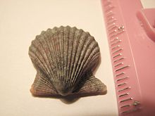 The rough scallop, Aequipecten muscosus, grows up to 1.75 in (4.4 cm). It has a small, scallop-shaped shell with about 20 strong ribs which have many erect scales or small spines near the margin. The hinge line has ears.
