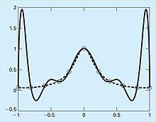 which is now called Runge's function. He took equidistantly spaced data points from this function over the interval . He then used interpolating polynomials of increasing order and found that as he took more points, the polynomials and the original curve differed considerably as illustrated in Figure “Comparison1” and Figure “Comparison 2”. Further, the situation deteriorated greatly as the order was increased. As shown in Figure “Comparison 2”, the fit has gotten even worse, particularly at the ends of the interval.