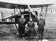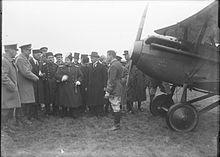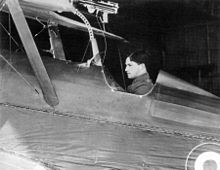 In March 1917, the S.E.5 entered service with No. 56 Squadron RFC, although the squadron did not deploy to the Western Front until the following month.[15] Everyone was suspicious of the large "greenhouse" windscreens fitted to the first production models. These were designed to protect the pilot in his unusually high seating position, which was in turn intended to improve vision over the upper wing. The squadron did not fly its first patrol with the S.E.5 until 22 April,[16] by which time, on the insistence of Major Blomfield, 56 squadron's commanding officer,[4] all aircraft had been fitted with small rectangular screens of conventional design. The problem of the high seating position was solved by simply lowering it, pilots in any case preferring a more conventional (and comfortable) seating position. No complaints seem to have been made about the view from the cockpit; in fact, this was often cited as one of the strong points of the type.