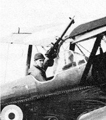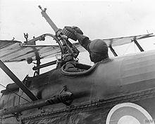 The S.E.5 was armed with a single synchronised .303-inch Vickers machine gun in contrast to the Camel's two, but it also had a wing-mounted Lewis gun fitted on a Foster mounting, which enabled the pilot to fire at an enemy aircraft from below.[9][10] This armament configuration was much appreciated by the pilots of the first S.E.5 squadrons as the new hydraulic-link "C.C." synchronising gear for the Vickers machine gun was unreliable at first. The Vickers gun was mounted on the forward left dorsal surface of the fuselage with the breech inside the cockpit, at a slight upwards angle. Typically, spare magazines for the Lewis gun would have been placed within most of the free space in the cockpit including the forward areas, such as the instrumentation panel.[14]