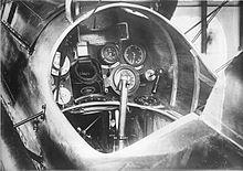 The standard instrument panel included a compass, altimeter, tachometer, oil pressure indicator, airspeed gauge, radiator temperature dial, fuel air pressure indicator, fuel selector, and air exchange; these were somewhat difficult to view due to their low-set position in the cockpit.[5] According to "Dodge" Bailey, Chief Test Pilot of the Shuttleworth Collection, the S.E.5's cockpit was "the best of the bunch from the era".[5] Individual in-service S.E.5s would often receive customisations and user-specified tweaks at the request of their pilots.[13] Popular changes included reducing the dihedral of the wings in order to increase its manoeuvrability and the removal of the head fairing to increase the pilot's visibility to the rear. James McCudden, an ace pilot, was famous for his prolific fine-tuning of his aircraft in order to produce improved performance from it; McCudden was able to increase the top speed by 9 mph and to raise the service ceiling from the standard 17,000 ft to 20,000 ft. His adaptions included replacing the standard pistons with high compression versions, shortening the exhaust (saving weight and improving exhaust scavenging), and changes to mixture, ignition and other engine settings as well as fitting a salvaged German propeller spinner (which he himself credited as gaining 3 mph alone) .[13]