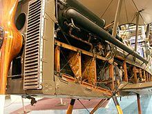 The S.E.5 was powered by various engines, initially adopting a Hispano-Suiza 8 V8 engine.[14] The Hispano-Suiza engine was advanced for the era, incorporating such features as an aluminium cylinder block with steel liners, dual ignition and forced lubrication that aided cooling; especially compared with contemporary rotary engines, it had the advantage of being easy to operate by most pilots. An expansion tank for the cooling system was integrated into the leading edge of the upper wing's centre section.[14] The S.E.5 was relatively easy to fly, albeit with the exception of an excessive amount of adverse yaw.[14] The yaw could be compensated for by balanced application of the aileron and rudder, whilst adjustment of the elevator trim made it possible to fly in a 'hands off' manner.[14]