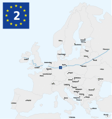 The Royal Canal Way is a 144-kilometre (89-mile) long-distance trail that follows the towpath of the canal from Ashtown, Dublin to Cloondara, County Longford.[5] It is typically completed in three days.[5] It is designated as a National Waymarked Trail by the National Trails Office of the Irish Sports Council and is managed by Waterways Ireland.[5] In 2015, Dublin City Council began extending the walking and cycling route along the Royal Canal from Ashtown to Sheriff Street Upper. The Royal Canal Way connects with the Westmeath Way west of Mullingar, and will eventually form the eastern end of the Dublin-Galway Greenway, the final part of EuroVelo Route 2, a cycling path from Moscow across Europe to Galway.[6][7][8][9]