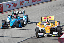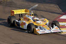 In 2014 Hunter-Reay returned with Andretti Autosport to drive the #28 DHL Dallara DW12-Honda Indy Turbo V6. At the season-opening Firestone Grand Prix of St. Petersburg on the Streets of St. Petersburg Hunter-Reay started 3rd and finished 2nd. At the following race, the Toyota Grand Prix of Long Beach on the Streets of Long Beach, Hunter-Reay qualified on the pole position. In the race Hunter-Reay led for a race-high 51 laps. On lap 56 Josef Newgarden, who had battled with Hunter-Reay and Hunter-Reay's teammate James Hinchcliffe for most of the race, came out of the pit lane in 6th place after losing the lead to Sebastián Saavedra, Scott Dixon, Marco Andretti, Justin Wilson and Tony Kanaan. Hunter-Reay and Hinchcliffe, in 7th and 8th, were with Newgarden when he exited the pit lane. Hunter-Reay then attempted to pass for the eventual lead (after Dixon and Wilson). When Hunter-Reay attempted this the three cars crashed. The crash would involve Hunter-Reay, Hinchcliffe, Newgarden, Hélio Castroneves, Jack Hawksworth, Kanaan and Takuma Sato. Hunter-Reay would finish 20th. Following the race Hunter-Reay was criticized by Hinchcliffe, who called it a "rookie move". Hunter-Reay then won the following race, the Honda Indy Grand Prix of Alabama at Barber Motorsports Park after starting 3rd and leading for a race-high 40 laps. Hunter-Reay then finished 2nd at the Grand Prix of Indianapolis at the Indianapolis Motor Speedway road course. At the 2014 Indianapolis 500 Hunter-Reay qualified a disappointing 19th; however, he would win the race by 0.0600 seconds over Castoneves, the second-closest finish in Indianapolis 500 history behind 1992.[6] Following Indianapolis Hunter-Reay took the points lead from Will Power. Hunter-Reay would then struggle during the next three races. At the Chevrolet Detroit Belle Isle Grand Prix twin races at Belle Isle State Park Hunter-Reay started 21st in each race (out of 22 cars). In race #1 Hunter-Reay crashed into a tire wall on the 70th (final) lap of the race and finished in 16th place. In race #2 Hunter-Reay suffered an electrical problem on lap 61 of 70 and finished in 19th place. Following the second Detroit race Hunter-Reay dropped to 3rd in points behind Power and Castroneves. At the following race, the Firestone 600 at Texas Motor Speedway, Hunter-Reay started 12th and finished 19th due to an engine fire after 136 laps. At the Shell and Pennzoil Grand Prix of Houston twin races at NRG Park were more successful for Hunter-Reay than the previous twin races at Detroit. In race #1 Hunter-Reay started 8th and finished 7th. In race #2 Hunter-Reay started 21st (out of 23 cars) and finished 6th. At the Pocono IndyCar 500 at Pocono Raceway Hunter-Reay started 9th and had mechanical problems early in the race. Hunter-Reay's team was able to repair the issue and Hunter-Reay finished 18th, nineteen laps down. At the following race, the Iowa Corn Indy 300 at Iowa Speedway, Hunter-Reay started 13th and was running in the top 10. On lap 282 of 300 Juan Pablo Montoya and Carpenter made contact (Montoya retired from the race while Carpenter continued). During the caution Hunter-Reay, Carpenter, Newgarden and Graham Rahal all made pit stops for new tires. On the restart on 291 the group quickly moved up through the field. On lap 299 Hunter-Reay passed Kanaan, who had dominated the race up to that point, for the lead. Hunter-Reay would go on to win the race after leading for only 2 laps in what would be Hunter-Reay's first lead lap finish of the season since winning the Indianapolis 500. Newgarden finished 2nd, Carpenter finished 5th and Rahal finished 7th. At the following races, the Honda Indy Toronto twin races at Exhibition Place, Hunter-Reay started 3rd in race #1 and 4th in race #2. In race #1 Hunter-Reay was battling with Kanaan on lap 40 when the two made contact, causing Hunter-Reay to crash into the wall and finish in 21st place. In race #2 Hunter-Reay finished in 14th place on the lead (56th) lap after several teams, including Hunter-Reay's, had their strategies changed during the race due to rain being on certain parts of the track at certain times. At the following race of the season, the Honda Indy 200 at Mid-Ohio at Mid-Ohio Sports Car Course, Hunter-Reay started 5th and spun out on lap 37. Despite the spin Hunter-Reay finished in 10th place. completing all 90 laps of the race. At the following race, the ABC Supply Wisconsin 250 at Milwaukee IndyFest Presented by the Metro Milwaukee Honda Dealers at the Milwaukee Mile, Hunter-Reay had a poor qualifying performance and would start in 19th place due to the set up of the car being different than in practice (during practice Hunter-Reay had the 3rd fastest lap speed in the first practice session and the 6th fastest lap speed in the second practice session). In the race Hunter-Reay moved up through the field. After completing 168 laps Hunter-Reay had to retire from the race due to a damaged suspension and would finish in 21st place. At the following race, the GoPro Indy Grand Prix of Sonoma at Sonoma Raceway Hunter-Reay started 10th after having the fastest lap speed in the first practice session and the 3rd fastest lap speed in the second session. In the race Hunter-Reay moved into 4th place after Hélio Castroneves, Ryan Briscoe, Sébastien Bourdais and James Hinchcliffe (all of whom had qualified ahead of Hunter-Reay) were involved in a crash in turn 1. Hunter-Reay would finish 2nd to Scott Dixon after Rahal had to make a late race pit stop for fuel from the lead while Mike Conway, who was passed by Dixon and later Hunter-Reay immediately after Rahal pulled into the pit lane, ran out of fuel on the final lap of the race in the final turn of the track. Following the Sonoma race Hunter-Reay is ranked 4th in the point standings with 534 points. Following the race Hunter-Reay became ineligible to win the championship due to points leader Power leading Hunter-Reay by 93 points (Power would get 10 points for failing to